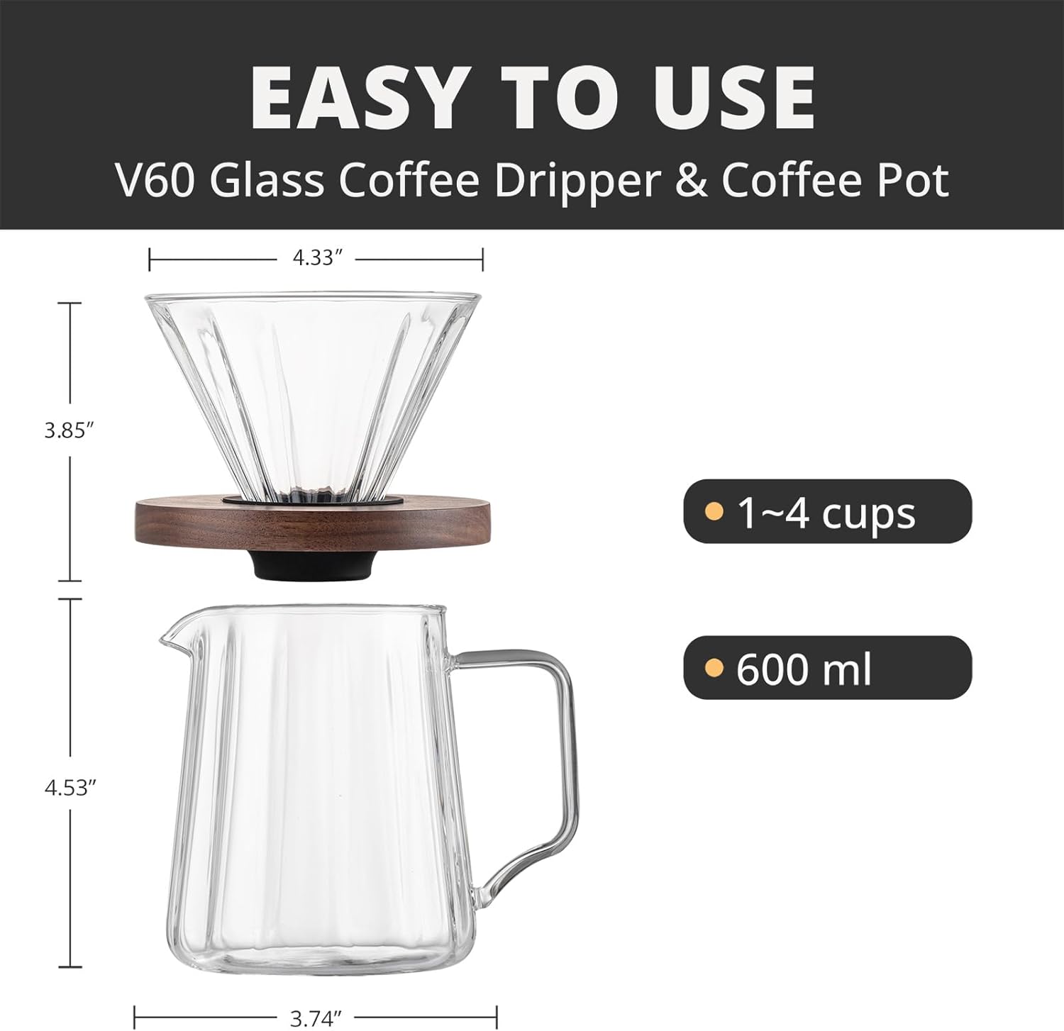 - Easy to Use: This 2 in 1 set includes V60 glass coffee dripper and 600ml coffee server. You can brew delicious coffee anywhere and anytime for only several minutes, which will bring you unique coffee extraction experience. Enjoy the fun of hand-made coffee.